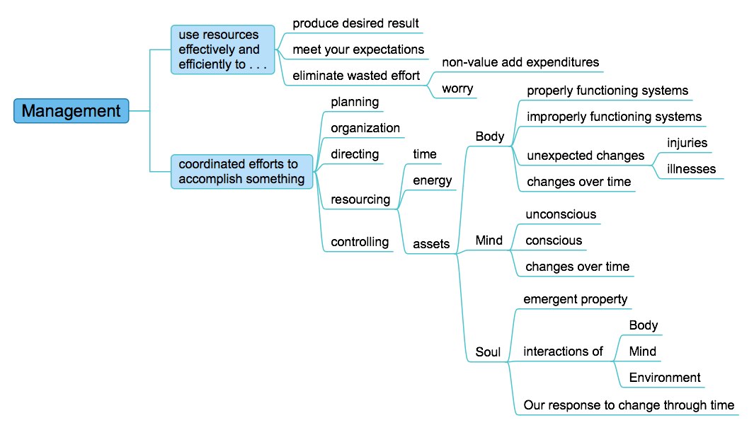 Our personal business management is the coordination of our efforts to accomplish something using our resources effectively and efficiently. It involves planning, organization, directing, resourcing and controlling ourselves in order to produce the results we desire, meet our own expectations and eliminate wasted effort. In doing so we need to learn to assess the value of our efforts and the resources we have at our disposal. There are fundamental resources available to all of us: time, energy and the assets of our body, mind and soul. How we use our resources determines much of our success. If we frivolously utilize our resources, we find worry, strife and regret. However, if we manage ourselves like a business, we can accomplish what we intend.