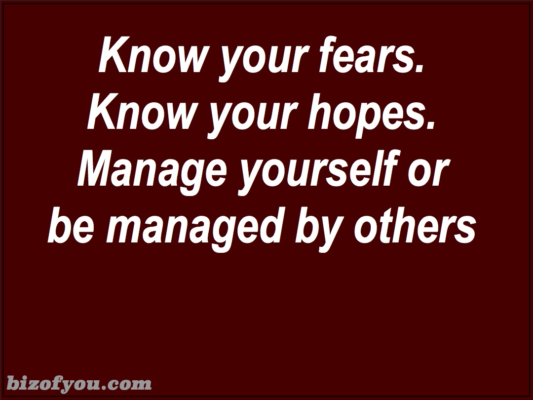 Do you know what your motivations are? Understanding your motivations is a key component in managing the business of you. Our decisions and actions can better serve our purposes when we know what we want or at least want to avoid. This takes intellectual honesty as some of our desires are deep-seated and may even disturb us. Nonetheless, when we look at the mirror inside ourselves we have the opportunity to satiate our deepest desires if we decide it appropriate to do so. What’s appropriate depends on the desire, our current situation, the consequences of our actions and what we want to create in the future. Sometimes it may take years and patient activity to manifest our deepest desires. Other times our desires may be fulfilled by taken advantage of the opportunities that present themselves in our problems and daily issues.