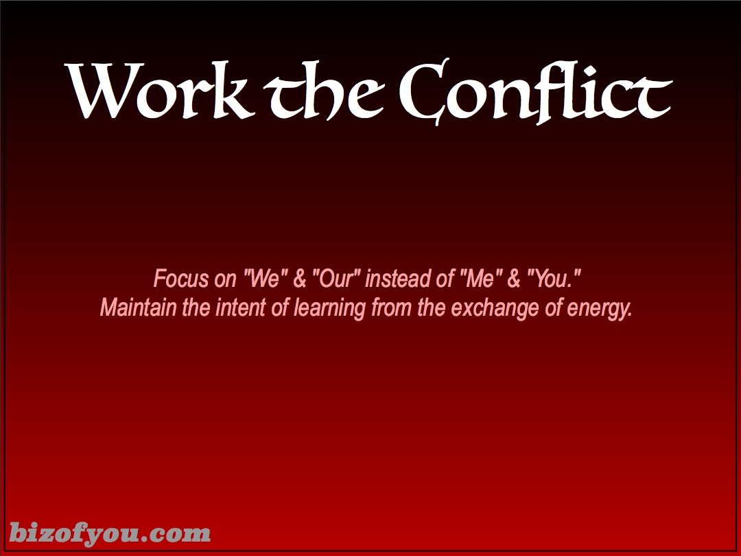 Conflict arises in our lives in all kinds of ways. It may be at work, with our significant others, our kids or our own competing desires. No matter where we encounter conflict the biz of you benefits when you allow it to happen with the intent of learning from it. Conflict is not necessarily a bad thing and more often than not, we can learn something from it. There are many conflict resolution techniques including competing, collaborating, compromising, withdrawing or smoothing to name a few. We can benefit from conflict no matter what approach we take when we think of the conflict in terms of “we” and “our” instead of “you” and “I” as well as maintaining the intent of learning from the conflict. Going into conflict with this type of open-mindedness enables us to see others viewpoints and the strength of argument. Keeping a level head during our encounters allows us to use the information we gain to find solutions that can benefit not only ourselves but others as well. Obviously, there are times when this is not possible and we may have to simply bow out.