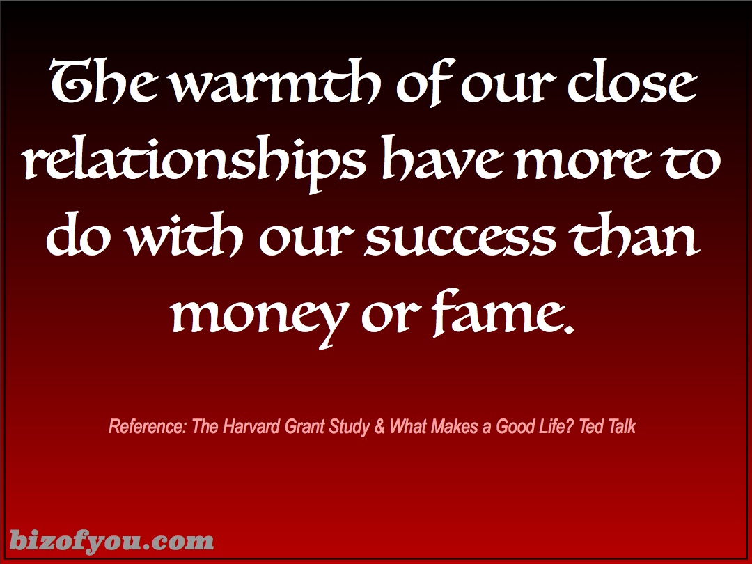 From the Biz of You perspective our social connections are one of the primary resources we have to nurture and steward throughout our lives. We do this by using our available time to connect and reconnect with those in our networks both close and afar, not just online or in chat rooms, but face to face where we interact and share energy and ideas. How we interact with our environment and more specifically the people we care about has more to do with the Biz of You than how much money you make or put away for retirement.