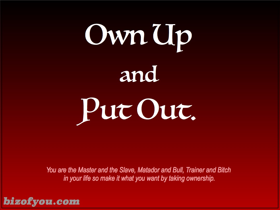 This is true of people as well. We flounder and get lost in meaninglessness when we do not have any idea of what we want in life, no vision of the future, or understanding of ourselves. We become tools of those that do have a sense of these things and then get upset about being manipulated. Managing the Biz of You includes learning how to be a leader in our own lives. To manage ourselves we have to have goals for ourselves, act in ways to accomplish those goals and affirm our own values. When we manage our biz we continually develop the life we value. It’s up to us to take the bull by the horns or the bitch by the collar and make shit happen. We just happen to be the bull and the matador or the bitch and the trainer. Pick your analogy and roll with it whether it be positive or negative. We are both the master and slave in our lives. Everything we do now pulls the strings of who and what we will become in the future. We are the primary cause of who we are. Own up to life, take the reins, and put out as you see fit.
