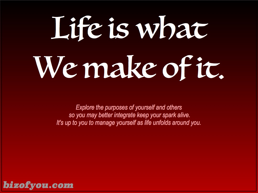 If there’s an essence of the biz of you, it is this. To manage our biz, we seek and explore our integration with the systems we interact with so we may keep our spark alive. We give ourselves meaning by fostering the resources that serve both the purpose of ourselves and others as reality unfolds around us. No matter what happens it’s up to us to keep our heart fire, emotional acumen and rational flexibility alive as life is what we make of it.
