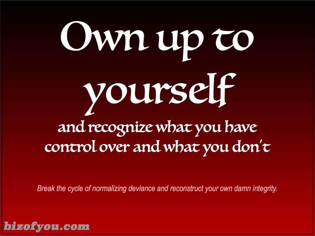 To stop our accepting deviant behavior, we first need to be aware of how we are enabling this behavior in others and allowing ourselves to deviate from our own integrity. We may have to ask others for feedback or seek other external information to determine how we are enabling ourselves and others to accept unacceptable behavior. Second, we need to step back in the midst of our stressful situations and reflect on our ownership of the problem. We ultimately can not control how others decide and act, but we can take ownership of our own decisions, actions, and behavior. It helps to admit it to others which gives them the opportunity to reflect on their own piece of the puzzle. It’s a slow methodical process of owning up to what’s happening and helping others to do the same. We have to do this over and over with the purpose of fostering integrity in ourselves and others. Ideally (at least in my head), this starts with leadership in the organizations we integrate with. However, there are varying degrees of awareness, ownership and accountability in the leaders in business today.