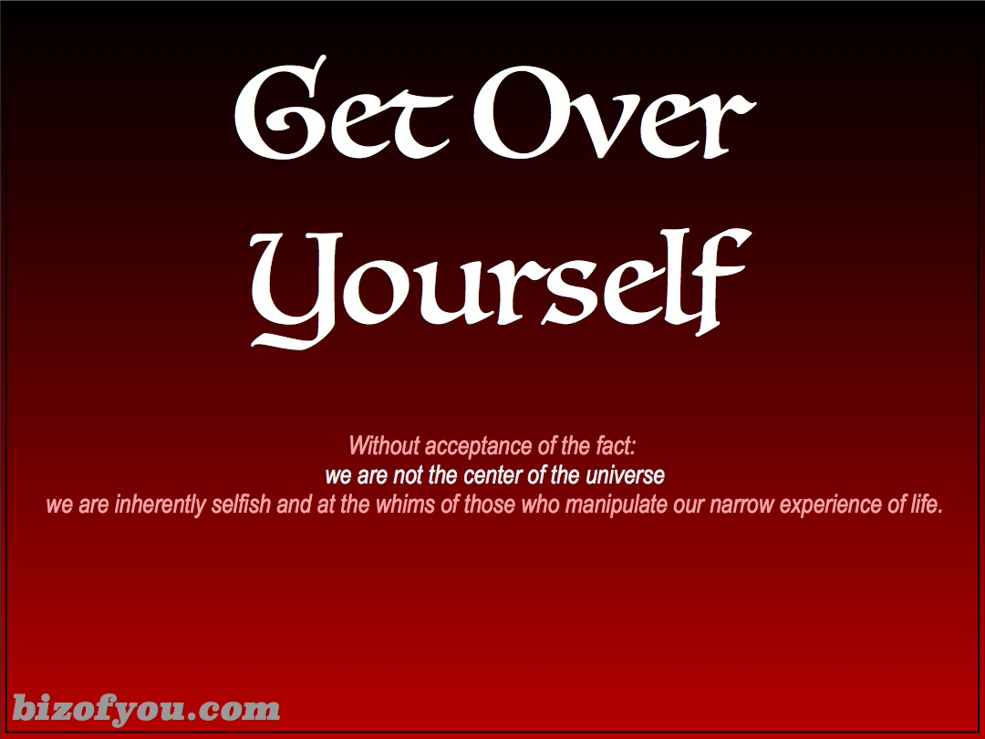 Accepting we are not the center of the universe and the uncertainty about how others experience the world is the first step towards building better relationships. We create our relationships and cultures with every interaction. This is true at work, in our social lives, playing road warrior driving home, or in our personal relationships. We are humans. We are fallible and make mistakes. We are all in this together. This acceptance is a cornerstone of managing the biz of you without which we are selfish and at the whims of those who manipulate our narrow experience of life. So for the sake of managing the biz of you, “Get over yourself.”